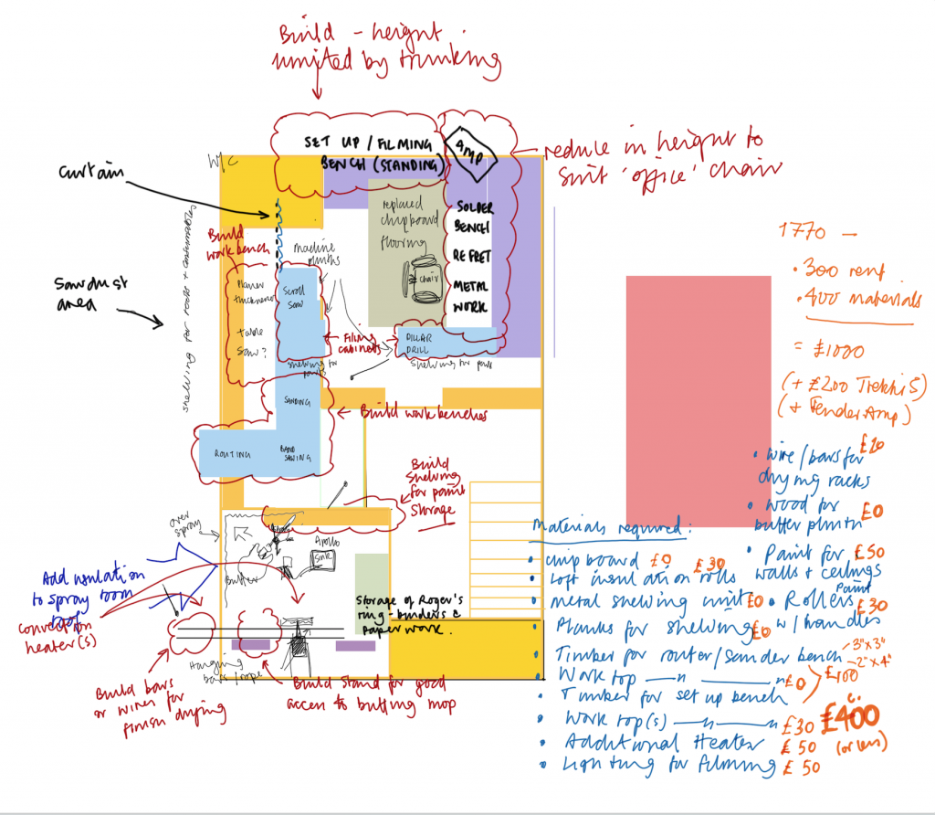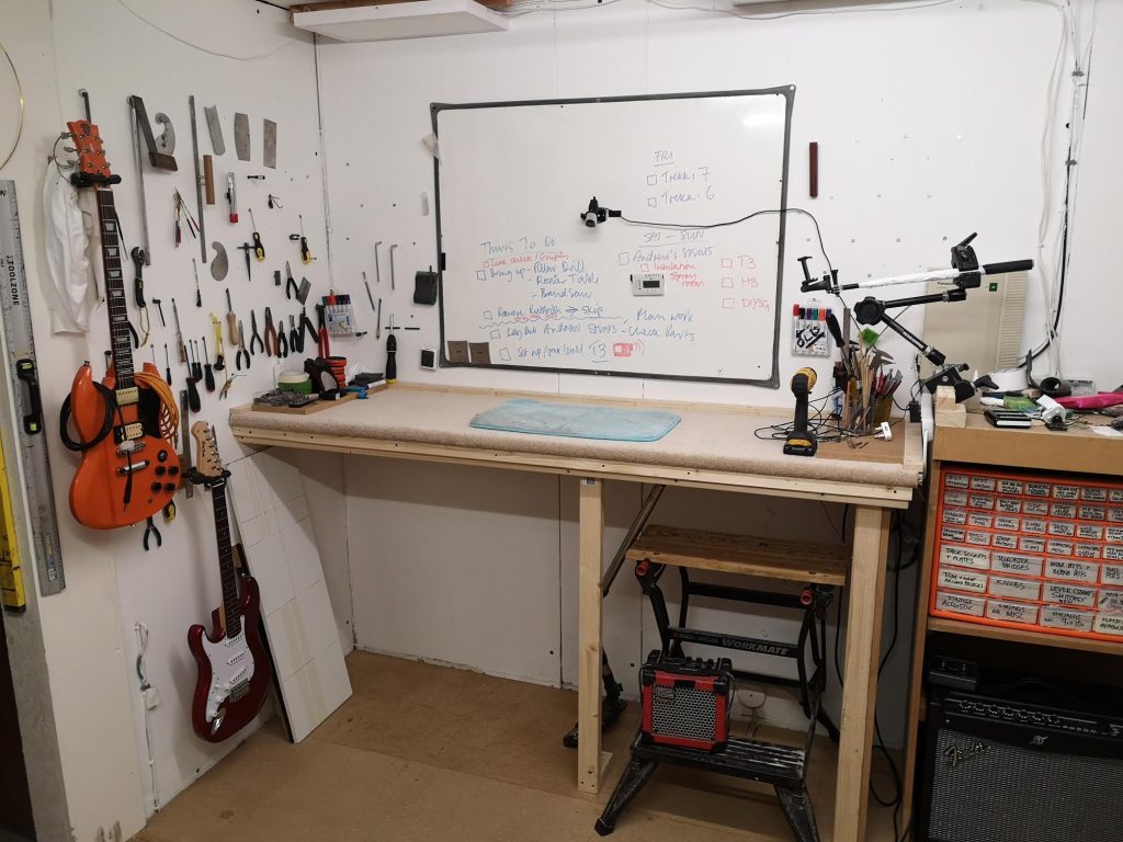 And from THAT perspective, I don’t YET need the perfect workbenches in the main room; I just need places to stand the key tools (bandsaw, pillar drill, bobbin sander) and a solid bench to rout on with a vice for filing work etc. I already a free-standing bench for wood work and fixing a vice and 2 of the machine stands are MDF cupboards currently in the storage area. So I’m going to focus on spaces in the priority order of outstanding jobs: 1) Spraying 2) guitar mods / making and lastly, 3) set ups / re-fretting etc. So this re-think has turned my priorities upside down – usefully as it happens. I will then have longer to plan and save the money (and find the right materials) for the standing setup bench and the seated soldering bench that eventually will be the key activities in the former ‘office’ space. More than anything, I’m noticing how slow this transition is. It’s limited partly because two days of the week are spent with Clare having chemotherapy, partly because money is short and partly because it’s tiring and I’m older and creakier than I once was!