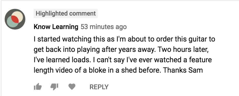 The reality is that people who don’t like the length / style / lack of editing in my videos aren’t my target market. This is not a convenient coincidence; I planned it to be this way. Being clear about who my target market is (and isn’t) allows me to say “Hey, no problem – I’m probably not the right channel / guitar tech for you” without any bad feeling. I’ve learned that as long as I make the right content for my target market (and don’t compromise chasing likes from everyone) I get everything I need from my channel and content.