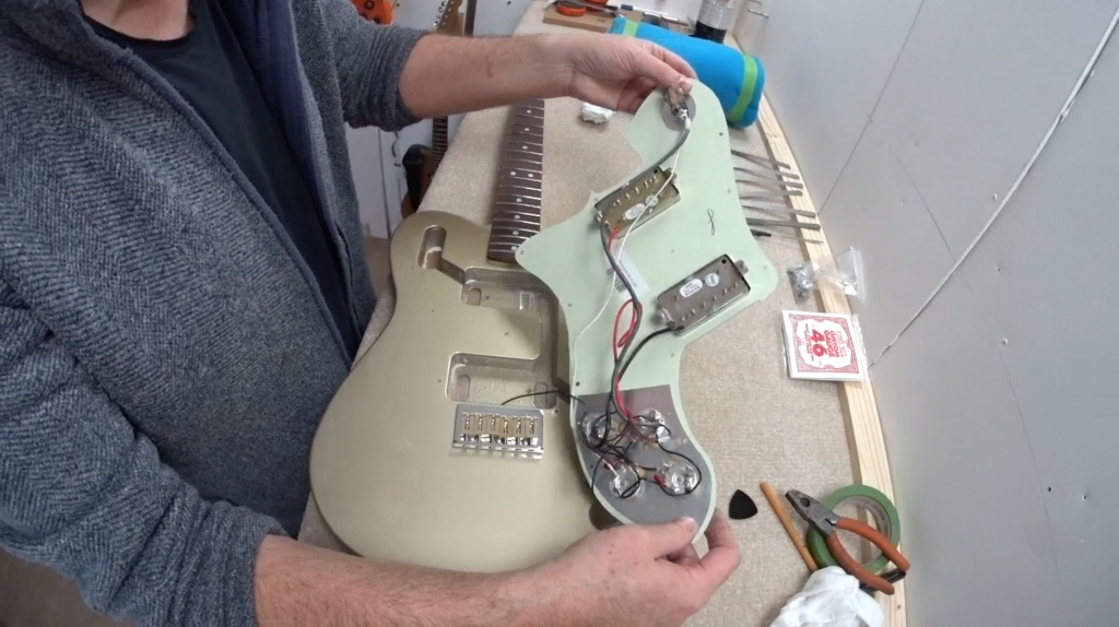 2) Fake it to make it: there were days when I didn’t think that I’d ever like the feel of this workshop; days when the familiar cosiness of the shed seemed very appealing. So much so that on some days it was all I could do just to make myself go up to the new workshop, dump some tools from the shed, look around a bit and head back home. I even found myself planning to continue using the shed to do set ups until after Christmas… and doing in the workshop only that which couldn’t be done in the shed (guitar modifications, building and spraying). That comforting little self-deception only had to last until I realised that I was quite liking the way it was developing – namely, shortly after building the first workbench and fixing up the ceiling-mounted LED lights. But on those days when my heart wasn’t in it I knew enough to know that the best I could do was to keep doing it; as if I believed in it. As soon as I’d finished the workbench I knew that it didn’t make sense to work in two places at once and I knew that the next set up I did would be in the new workshop, under the bright white lights and talking loudly to the cameras. And so it was!