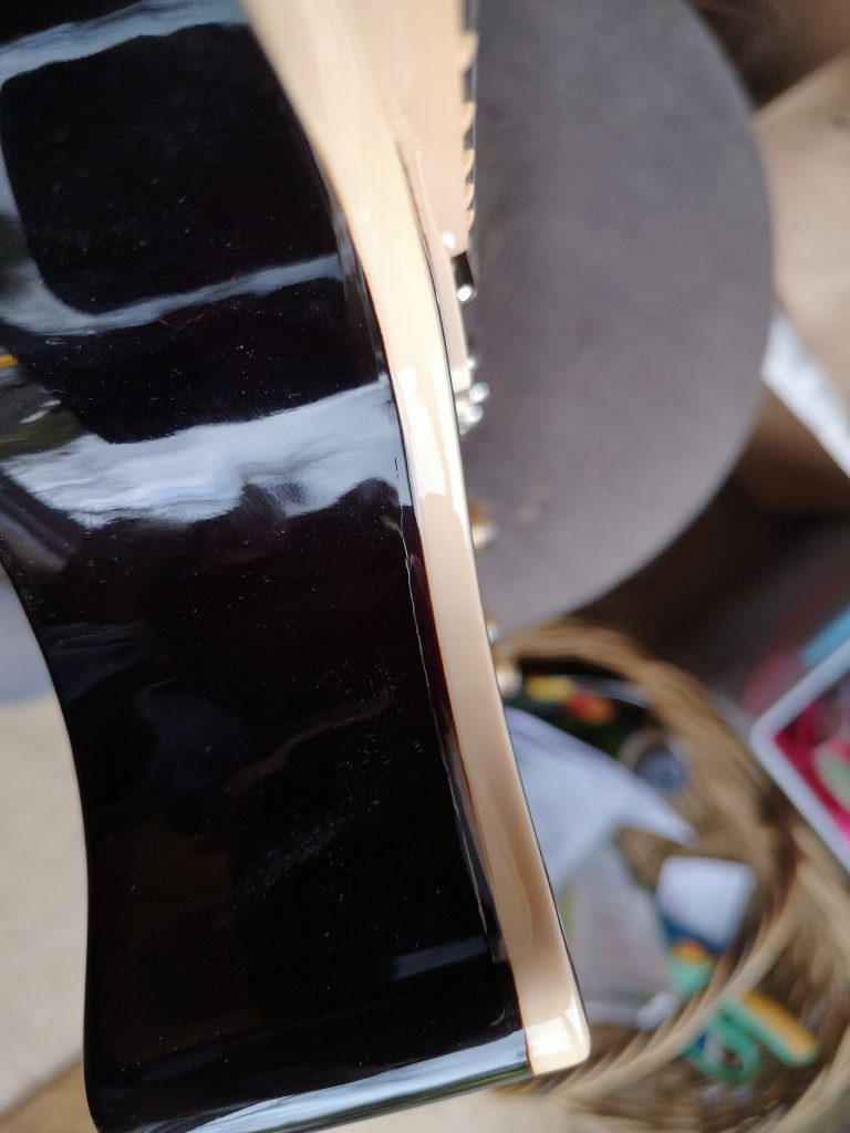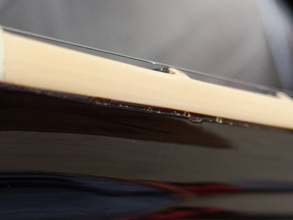 This happened to me at the weekend. I met a customer to collect his Gibson Les Paul and brought it home. Later that evening I took the guitar out of its case to check it over prior to taking it to the workshop for its set up and my fingers detected something amiss with the finish on the neck, on the treble side near the nut. It felt like a raised area; a bulge and although it wasn’t huge it was enough to know that if it was my guitar, I’d feel it every time I played it. On close examination, I found a 2″ long crack in the finish just under the binding and another fine crack about 3″ long inside the cutaway curve, also just under the binding.