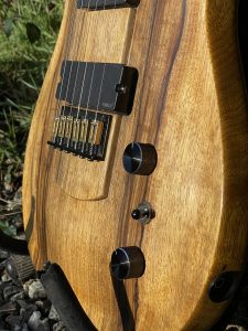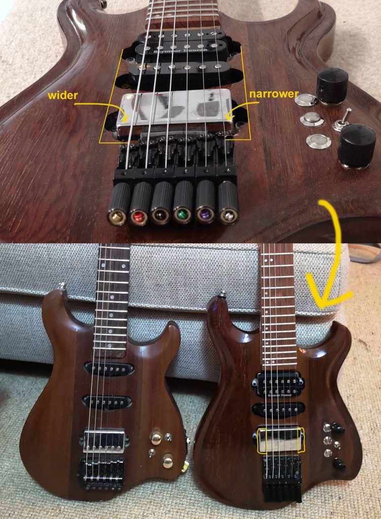 I only really noticed this imbalance when I came to finish this guitar the other day. It became clear that the pickup that I had for the bridge would look very mis-aligned particularly because it had regular pole screws. As it happens, it would have been a poor choice anyway – thanks to Seymour Duncan’s bizarre choice to make a majority of its ‘bridge’ humbuckers 48mm E-to-E pole spacing which guarantees the outer strings don’t sit over the poles – but even worse with this cavity misalignment. I decided that a temporary solution would be to use a pole-less humbucker that I had in the spares box. As you can see it just about works visually and it sounds fine but it’s obvious that by the time we get to the bridge pickup cavity it’s substantially off to one side.