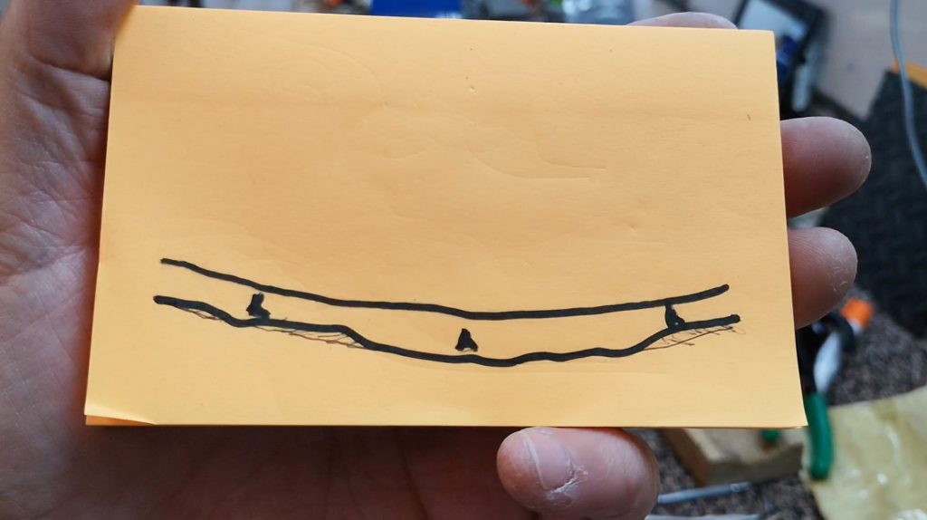 It took me until this year to realise that the Banana did help reduce and even cure ‘Fret Slap’ although to begin with I couldn’t understand how it did it. Eventually I worked out that because I ‘calibrate’ the Banana to the neck’s curve using the three brass feel (effectively ‘sampling’ the curve in 3 points) the Banana curve is always an ‘idealised’ version of the curve extrapolated from those 3 points. The Banana (otherwise known as a ‘truss rod with sandpaper on the underside of the flat bar part’) makes a smooth curve while the actual neck underneath it is anything but. Because wood is organic and springy, because the neck is under longitudinal compression and because manufacturing is relatively crude the actual neck is a bumpy, uneven curve – as shown in my sketch (above).