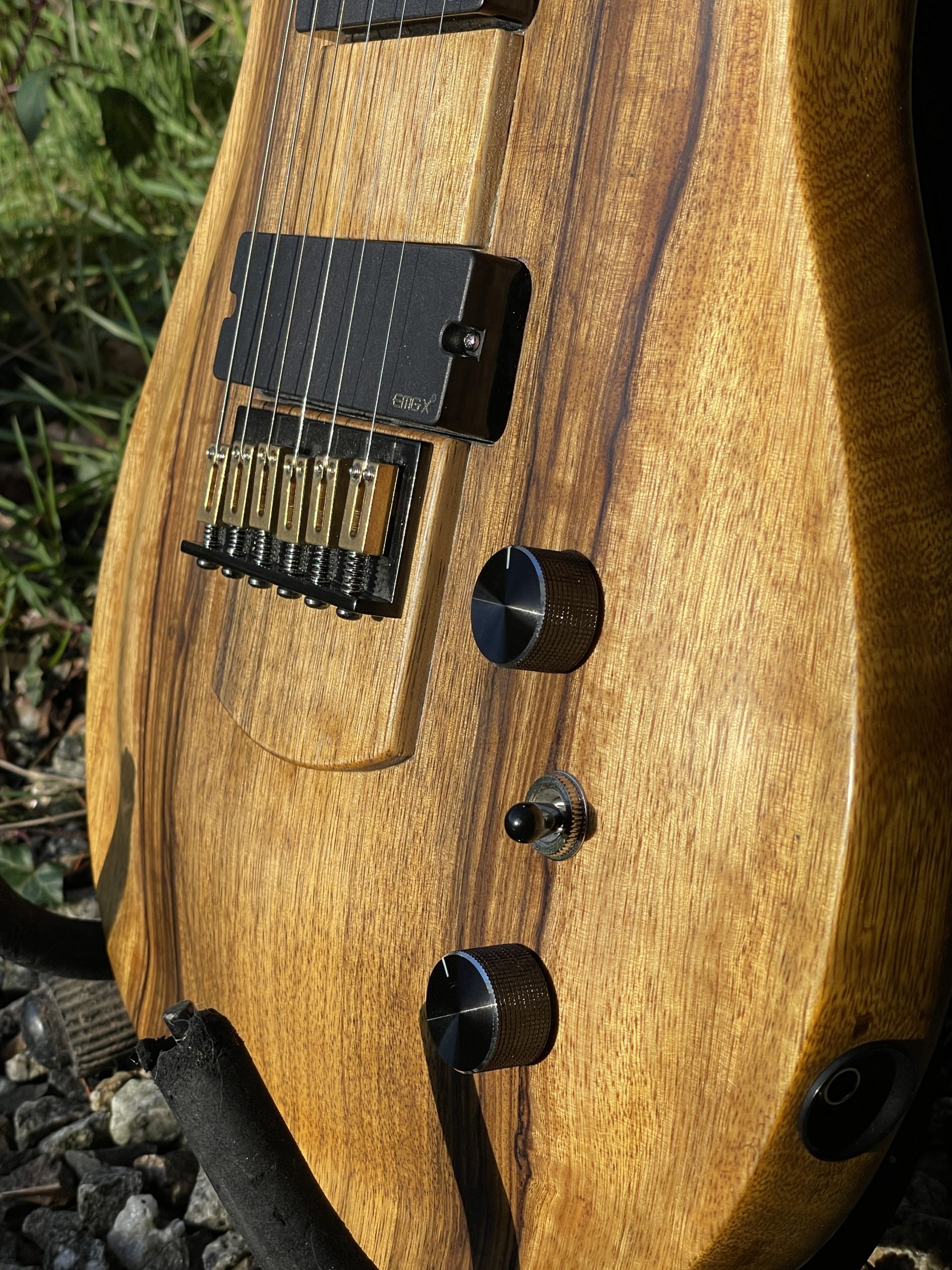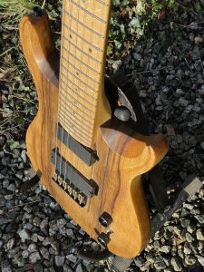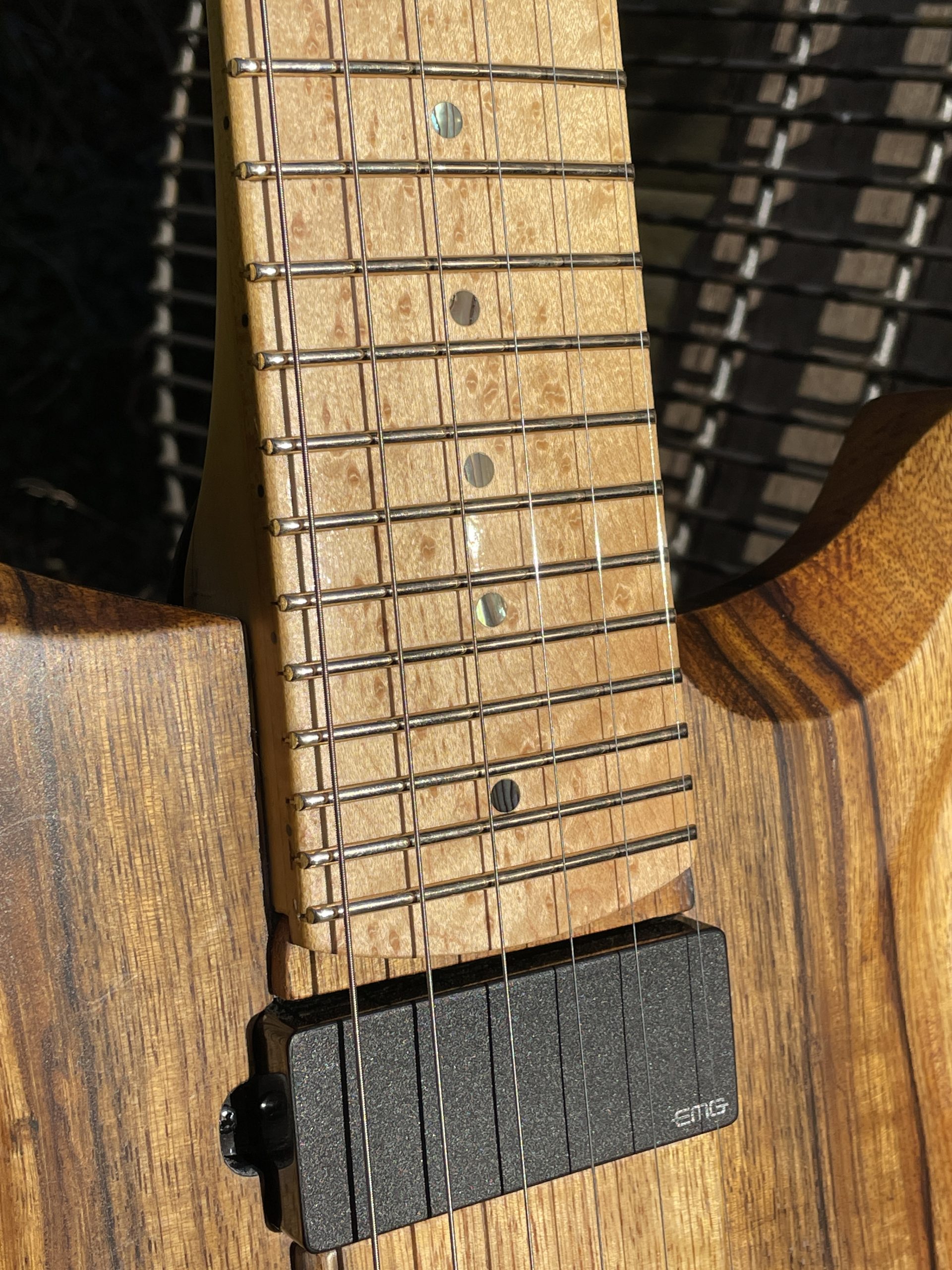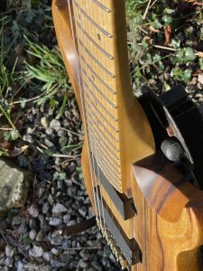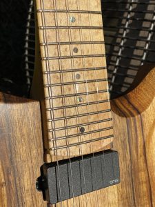 About a year and a half ago a customer of mine (who I had already made a 7-to-wide6-string conversion for) came back and asked if I could make an even wider necked guitar for him. I said “Yes… ” wondering what I was letting myself in for. I was fairly new to making my own necks from scratch; but this 25 fret, 60mm e-to-e at the nut neck was definitely going to be custom-made so I had no choice 🙂 I went quite a way to finding out what spacing my customer needed. The previous 48mm e-to-e spacing wasn’t enough, so I build a dummy section of neck (using a brand new bass neck, pulling the frets and re-fretting it like the first 3 frets of a very wide 6 string guitar!) and created pairs of nuts & saddles so that he could try out spacings of strings in 2mm increments. I fitted headless tuners and a locking brass block at the other end. (You can see the progress of this amazing build here: Ultra-ultra wide 6 string custom. My customer settled on 60mm e-to-e at the nut. To double check I mocked up the actual guitar dimensions that this would result in and made a double-thickness template and sent it to him in a cardboard box 😀 He responded that this was perfect for him. So I carried on. I had ordered two EMG 9 string active pickups; one was available and I placed an order with EMG for the other. A year later they STILL hadn’t built it so I went to plan C (plan B had been to use two regular humbuckers together in a ‘Z’) which was to use an 8-string EMG which I discovered just about covered the string spread near the 25th fret. And just the other day I finished it. What a monster – and amazingly, I enjoyed the challenge of playing it.